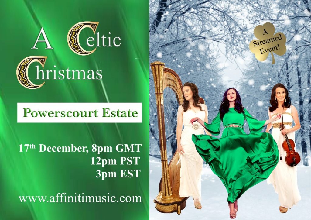 Affinití, Celtic inspired classical crossover group, announce a very special Christmas concert this December, filmed in the wonderfully atmospheric surroundings of Powerscourt House. Classically trained musicians Emer Barry (Soprano), Aisling Ennis (Harp) and Mary Mc Cague (Violin) have brought their Christmas show to the USA each year and are delighted to share ‘A Celtic Christmas’ with Irish music lovers for the first time. Highlights will include: