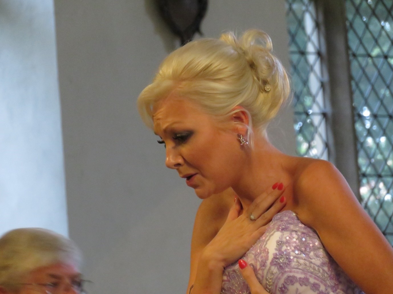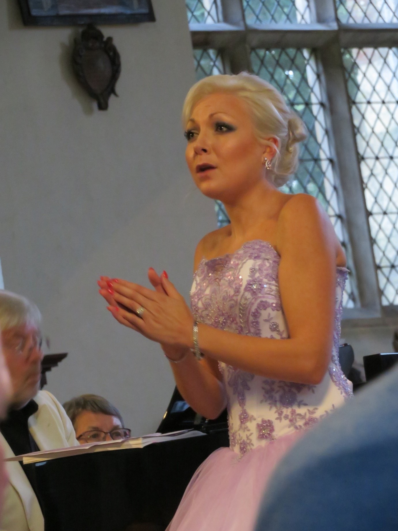 As Christina was introduced, she emerged from a door at the back of the church and walked down the centre aisle in a lilac/pink dress with a very full skirt and embroidered top. Christina’s first song was ‘Never Enough’ from ‘The Greatest Showman’, and she certainly sang it with style. I had noticed that there was no microphone at the front of the church. The MC had used a handheld radio mic for her introduction and I wondered if Christina would have her own. But no, she sang completely unamplified and her sweet voice filled the large space of the church with no hint of strain.