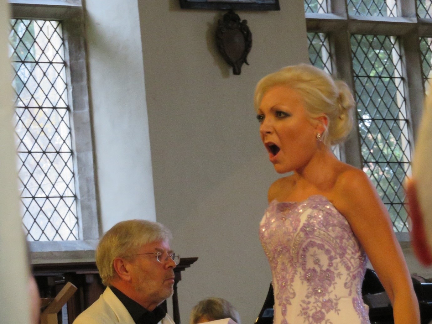 At last, it was time for the music to begin, with a piano solo by Geoff Lavery of ‘The Girl with the Flaxen Hair’ from ‘Ladies in Lavender’. Geoff stayed at the piano throughout the concert, interposing piano solos with accompaniment for Christina’s songs.