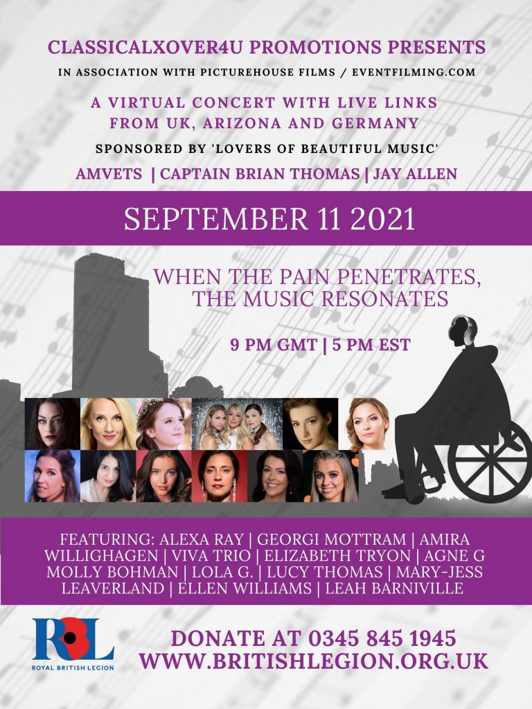 An online classical crossover concert is taking place on Saturday 11th September at 9pm UK time as part of a campaign to raise the profile of the power of music therapy programme interventions for veterans still struggling to come to terms with the impact of war.