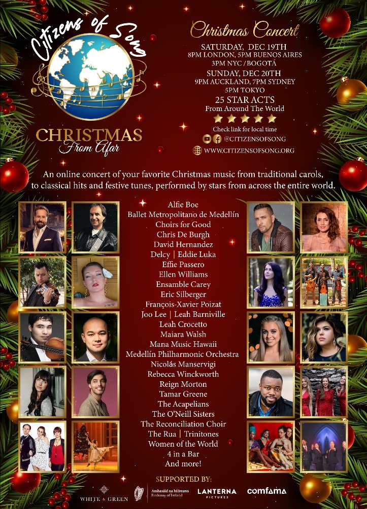 Citizens of Song –  Music Together From Afar seeks to unite the world and foster peace through song. Each online concert takes the audience on a musical journey to a new destination with a new musical theme direct from the performers’ own homes. Having already virtually travelled to Ireland, United Kingdom, and the USA, reaching over 70,000 people on all continents of the world, the show now presents it’s Christmas Gala Concert with over 25 acts, and up to 400 performers from around the world including orchestras, dance companies, choirs, bands and soloists.